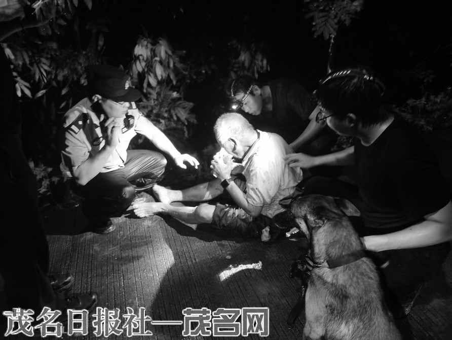 27日晚上7时,伴随着警犬“雷霆”兴奋的吠叫,民警终于发现了陈大爷的身影。他趴在一处水洼边,浑身湿透。