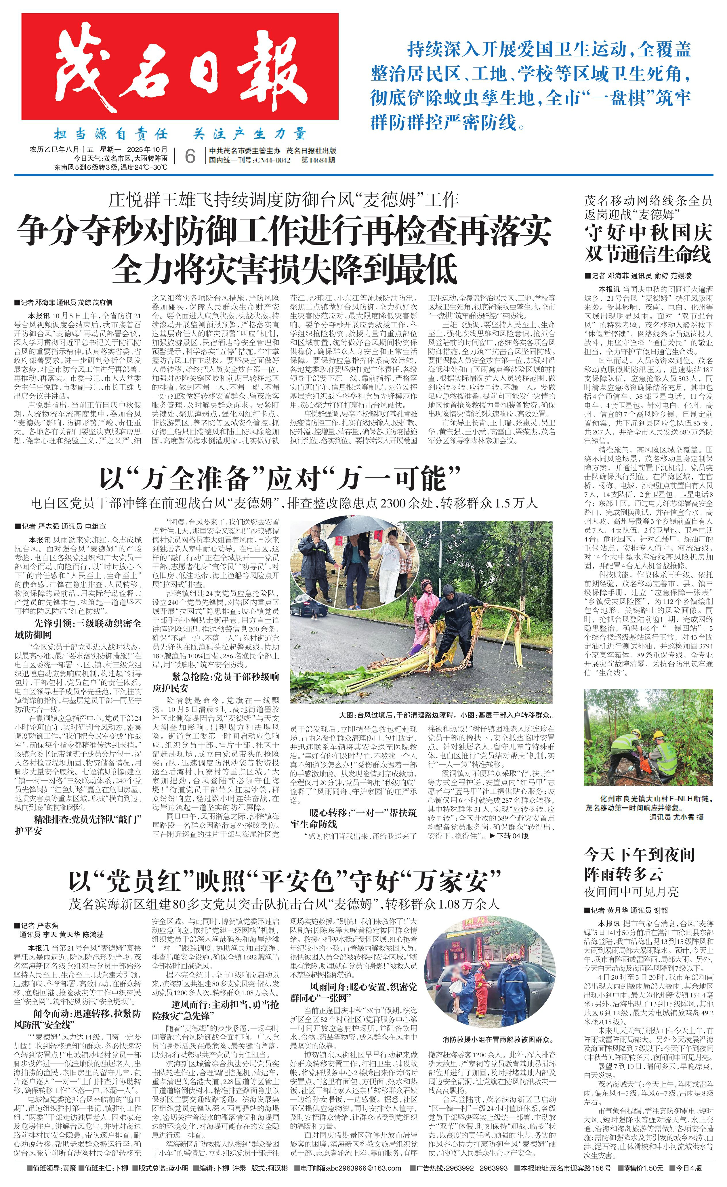 本报讯 据市气象台消息,台风“麦德姆”5日14时50分前后在湛江市徐闻县东部沿海登陆,我市沿海出现13到15级阵风和大雨到暴雨局部大暴雨降水。预计,今天上午,我市有阵雨或雷阵雨,局部大雨。另外,今天白天沿海及海面阵风降到7级以下。