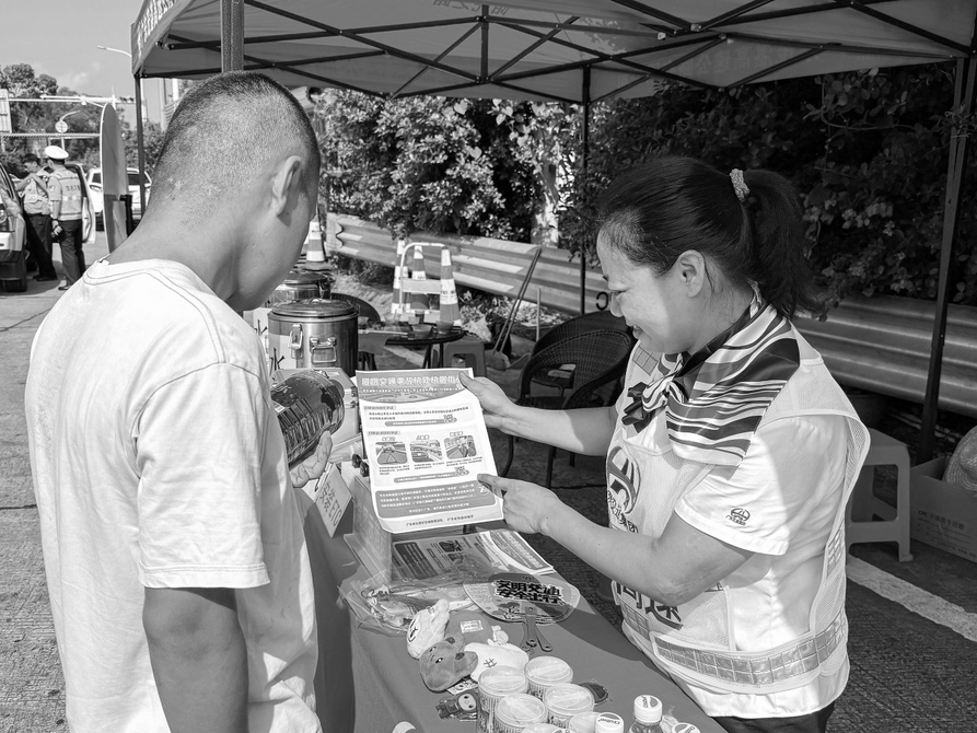 “师傅,这是道路交通安全指南,您可以了解一下。”针对“双节”期间车流较大特点,茂湛、包茂高速联合属地高速交警、交通运输等部门在多个服务区、站场服务岗等设立“交通安全普法宣传点”,通过现场讲解超速、疲劳驾驶、占用应急车道等违反交规的危害性,并结合典型事故案例以案释法,倡导文明驾驶。志愿者还针对老人、儿童特别讲解过马路和乘车注意事项,叮嘱勿搭乘非法营运车或超载车。