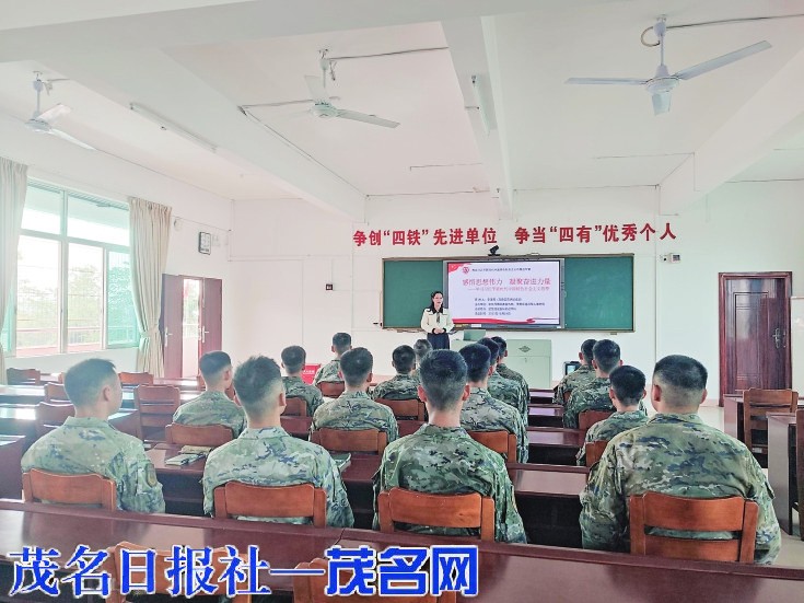 本报讯 昨天上午,茂南区委宣传部、茂南区退役军人事务局在武警茂名支队机动中队举办推动习近平新时代中国特色社会主义思想进军营活动。茂南区宣讲团成员李美霞向该中队的官兵们作以“感悟思想伟力凝聚奋进力量”为主题的宣讲(如图,茂名日报社全媒体记者刘付思明摄)。