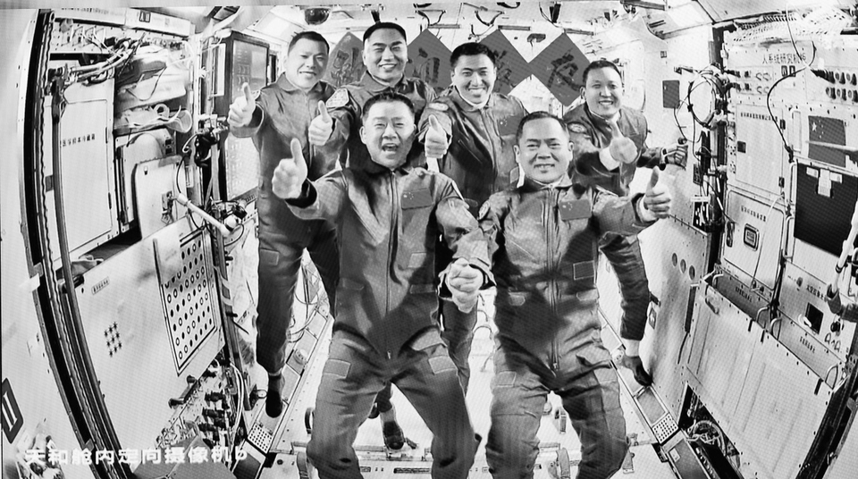 这是11月1日在北京航天飞行控制中心飞控大厅拍摄的神舟二十号航天员乘组和神舟二十一号航天员乘组会师后拍摄“全家福”照片的实时画面。新华社记者 金立旺 摄