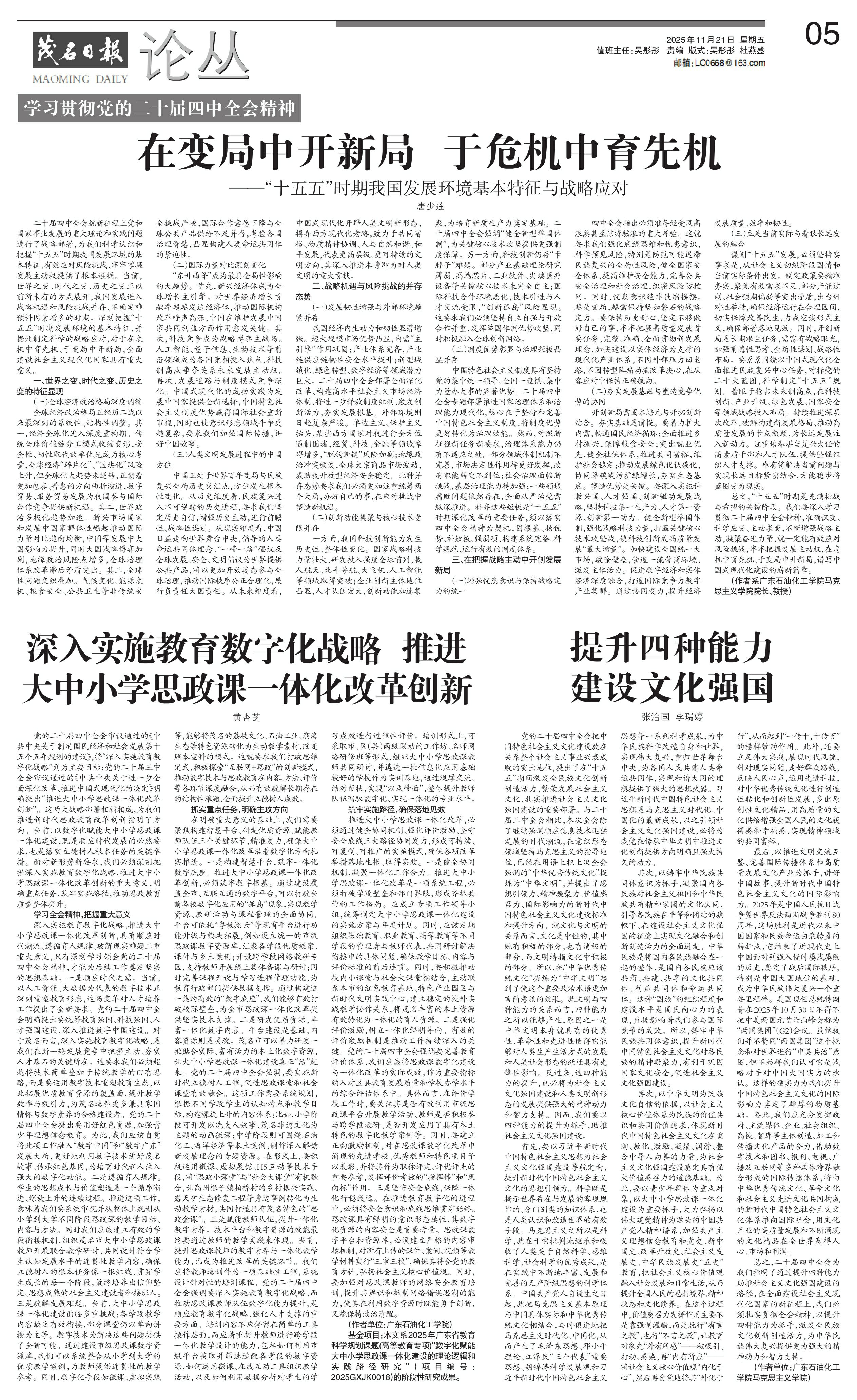 深入实施教育数字化战略、推进大中小学思政课一体化改革创新,具有顺应时代潮流、遵循育人规律、破解现实难题三重重大意义,只有深刻学习领会党的二十届四中全会精神,才能为后续工作奠定坚实的思想基础。一是顺应时代之需。当前,以人工智能、大数据为代表的数字技术正深刻重塑教育形态,这场变革对人才培养工作提出了全新要求。党的二十届四中全会明确提出要统筹教育强国、科技强国、人才强国建设,深入推进数字中国建设。对于茂名而言,深入实施教育数字化战略,是我们在新一轮发展竞争中把握主动、夯实人才基石的关键所在。这要求我们必须超越将技术简单叠加于传统教学的旧有思路,而是要运用数字技术重塑教育生态,以此拓展优质教育资源的覆盖面,提升教学效率与吸引力,为茂名培养更多兼具家国情怀与数字素养的合格建设者。党的二十届四中全会提出要用好红色资源,加强青少年理想信念教育。为此,我们应该自觉将此项工作融入“数字中国”和“数字广东”发展大局,更好地利用数字技术讲好茂名故事、传承红色基因,为培育时代新人注入强大的数字化动能。二是遵循育人规律。学生的思想成长与价值塑造是一个循序渐进、螺旋上升的连续过程。推进这项工作,意味着我们要系统审视并从整体上规划从小学到大学不同阶段思政课的教学目标、内容与方法。同时我们应该建立有效的学段衔接机制,组织茂名市大中小学思政课教师开展联合教学研讨,共同设计符合学生认知发展水平的连贯性教学内容,确保立德树人的根本任务像一根红线,贯穿学生成长的每一个阶段,最终培养出信仰坚定、思想成熟的社会主义建设者和接班人。三是破解发展难题。当前,大中小学思政课一体化建设面临多重挑战:各学段教学内容缺乏有效衔接,部分课堂仍以单向讲授为主等。数字技术为解决这些问题提供了全新可能。通过建设市级思政课数字资源库,我们可以系统整合从小学到大学的优质教学案例,为教师提供连贯性的教学参考。同时,数字化手段如微课、虚拟实践等,能够将茂名的荔枝文化、石油工业、滨海生态等特色资源转化为生动教学素材,改变照本宣科的模式。这就要求我们打破思维定式,积极探索“互联网+思政”的创新模式,推动数字技术与思政教育在内容、方法、评价等各环节深度融合,从而有效破解长期存在的结构性难题,全面提升立德树人成效。
