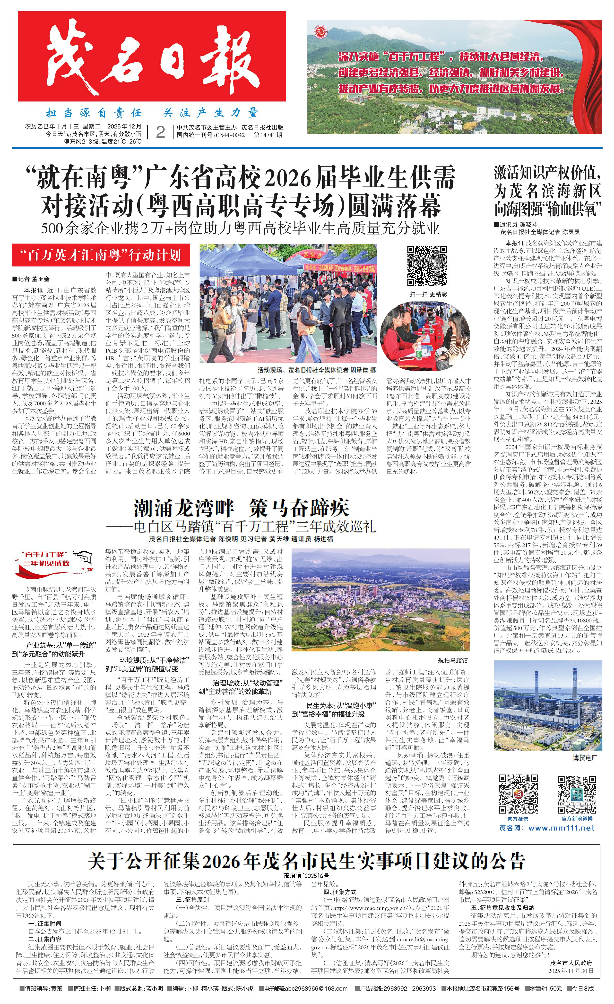 茂名职业技术学院办学39年来,始终坚持“让每一个毕业生都有职场出彩机会”的就业育人理念,始终坚持扎根粤西、服务全省、辐射周边,深耕职业教育,厚植工匠沃土,在服务广东“制造业当家”战略和湛茂一体化区域经济发展过程中展现了“茂职”担当,贡献了“茂职”力量。该校将以举办供需对接活动为契机,以广东省人才培养供需适配机制改革试点高校(粤东西北唯一高职院校)建设为抓手,全力构建“以产业需求为起点,以高质量就业为落脚点,以专业教育为支撑点”的“产业—专业—就业”三业闭环生态系统,努力把“就在南粤”供需对接活动打造成可供欠发达地区高职院校借鉴复制的“茂职”范式,为“双高”院校建设注入源源不断的新动能,力促粤西高职高专院校毕业生更高质量充分就业。