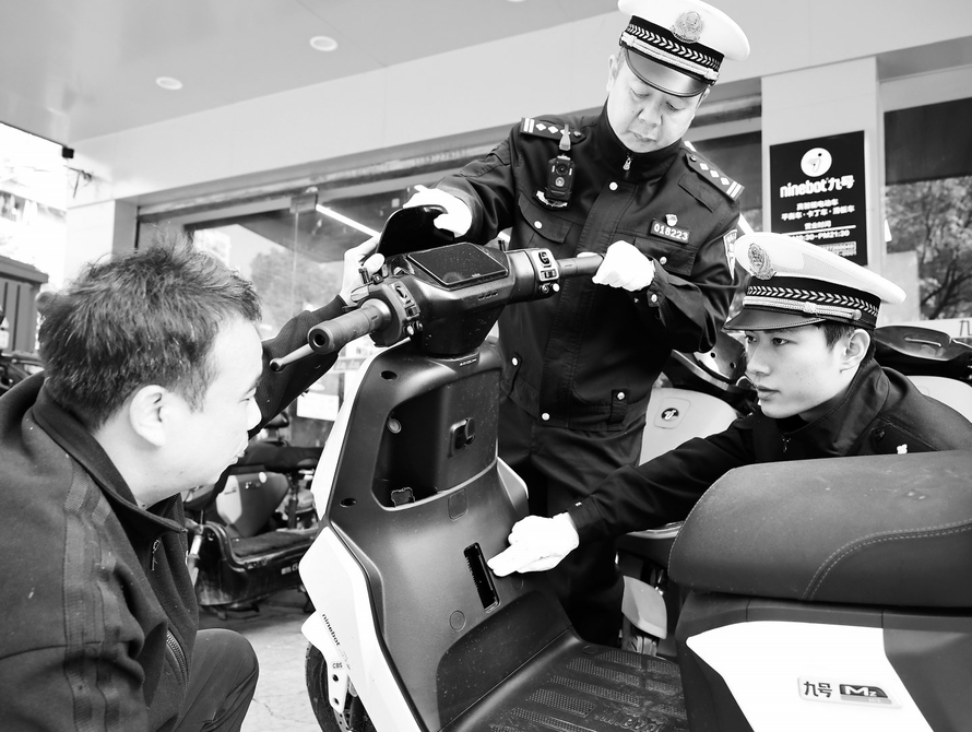 12月1日,在湖北省武汉市武昌区九号电动车平安路店,武昌区交通管理大队民警给销售人员宣讲“旧国标”电动自行车停售政策。 根据新版强制性国家标准《电动自行车安全技术规范》,12月1日之后,所有销售的电动自行车产品均必须符合新标准规定。新标准强化安全管理的同时,能更好满足消费者日常使用需求。 新华社发(赵军摄)