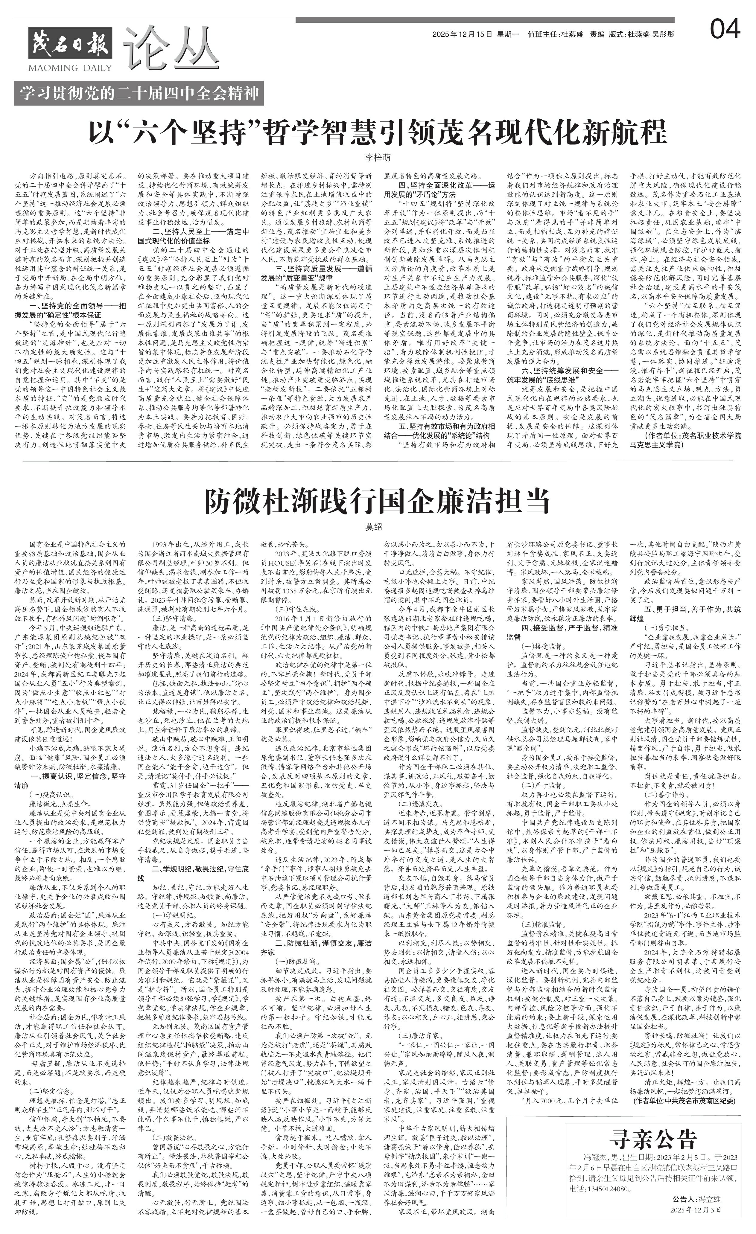 先辈之楷模,吾辈之典范。作为国企领导干部自当身体力行,做严于监督的领头雁。作为普通职员也要积极参与企业的廉政建设,发现问题及时举报,着力营造风清气正的企业环境。