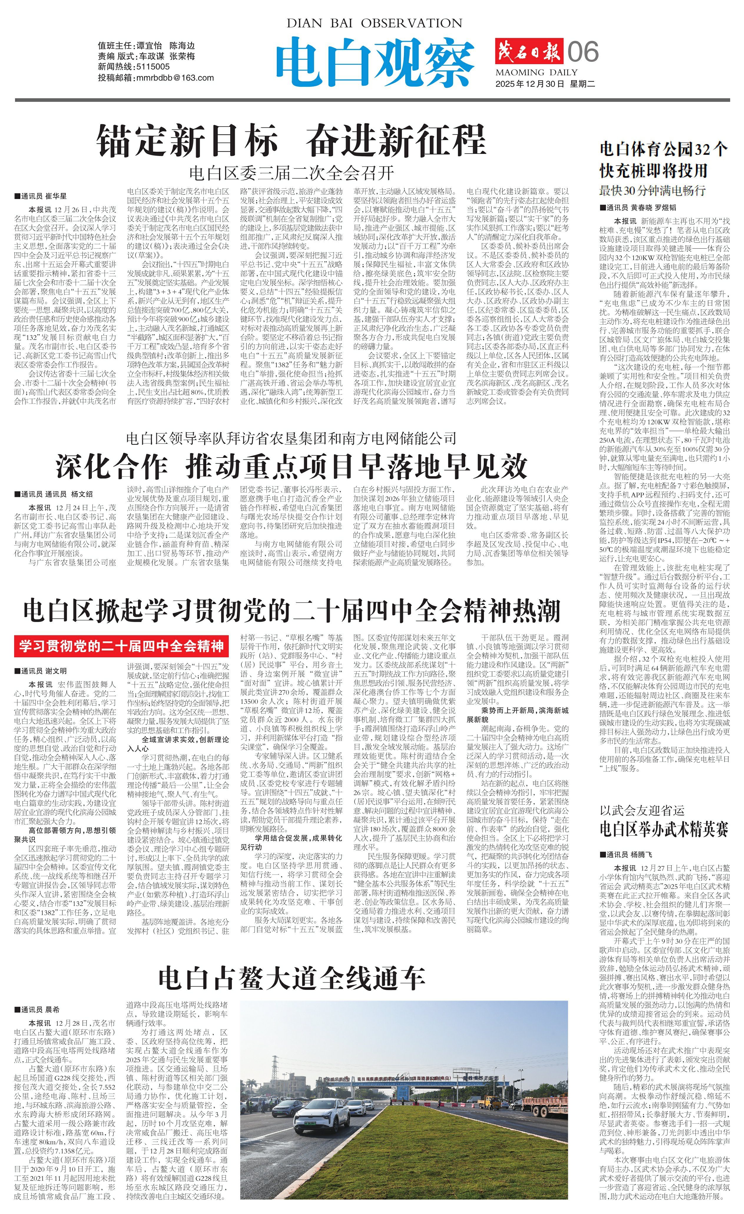 站在新的起点,电白区将继续以全会精神为指引,牢牢把握高质量发展首要任务,紧紧围绕建设宜居宜业宜游现代化滨海公园城市的奋斗目标,保持“走在前、作表率”的政治自觉,强化使命担当。全区上下必将把学习激发的热情转化为攻坚克难的锐气,把凝聚的共识转化为团结奋斗的实践,以更加昂扬的状态、更加务实的作风,奋力完成各项年度任务,科学绘就“十五五”发展新画卷,确保全会精神在电白结出丰硕成果,为茂名高质量发展作出新的更大贡献,奋力谱写现代化滨海公园城市建设的绚丽篇章。
