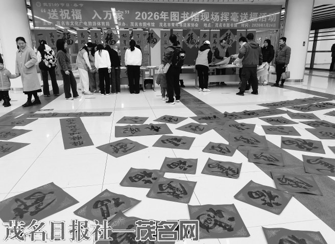 本报讯 1月24日,茂名市图书馆一楼大厅墨香四溢,暖意融融。由茂名市文化广电旅游体育局主办,茂名市图书馆与茂名市青年书法家协会承办的“我们的节日·春节——送祝福入万家”赠春联活动在这里举行(如图)。活动吸引了众多市民热情参与,书法家们现场挥毫泼墨,以笔墨传递温暖,将新春祝福送入千家万户。