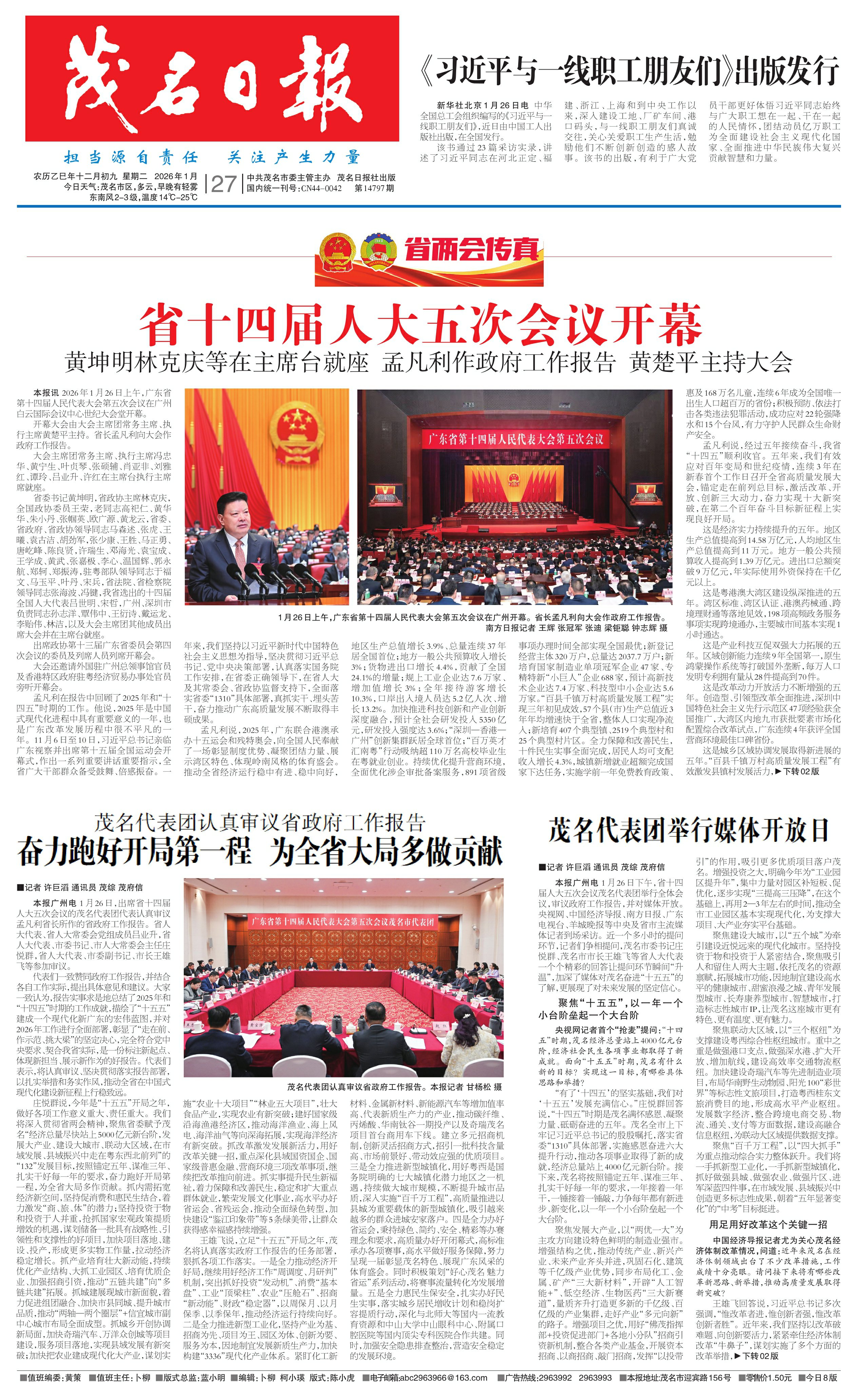 本报讯 2026年1月26日上午,广东省第十四届人民代表大会第五次会议在广州白云国际会议中心世纪大会堂开幕。