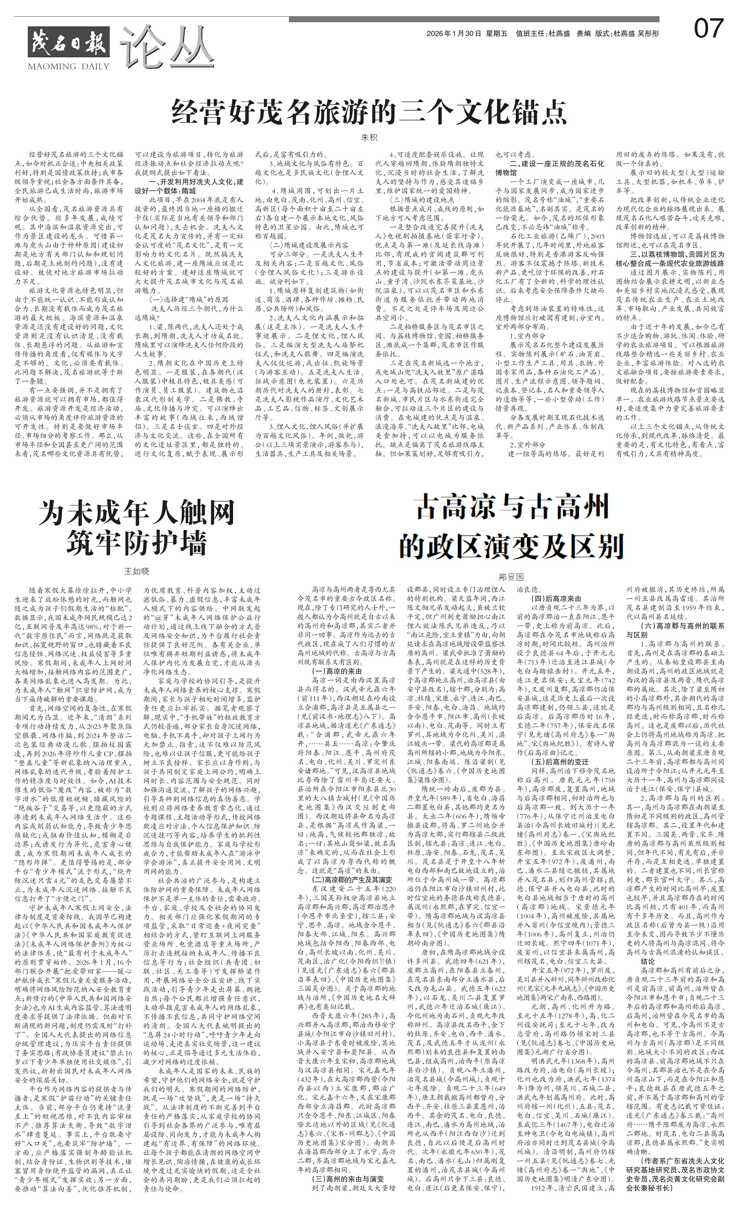高凉与高州两者是粤西尤其今茂名市的重要古今政区名称。现在,除了专门研究的人士外,一般人都认为今高州就是自古以来的高州府和高凉郡,其实二者并非同一回事。高凉作为远去的古代政区,现在成了人们习惯的古高州地域的代称。古高凉与古高州既有联系又有区别。