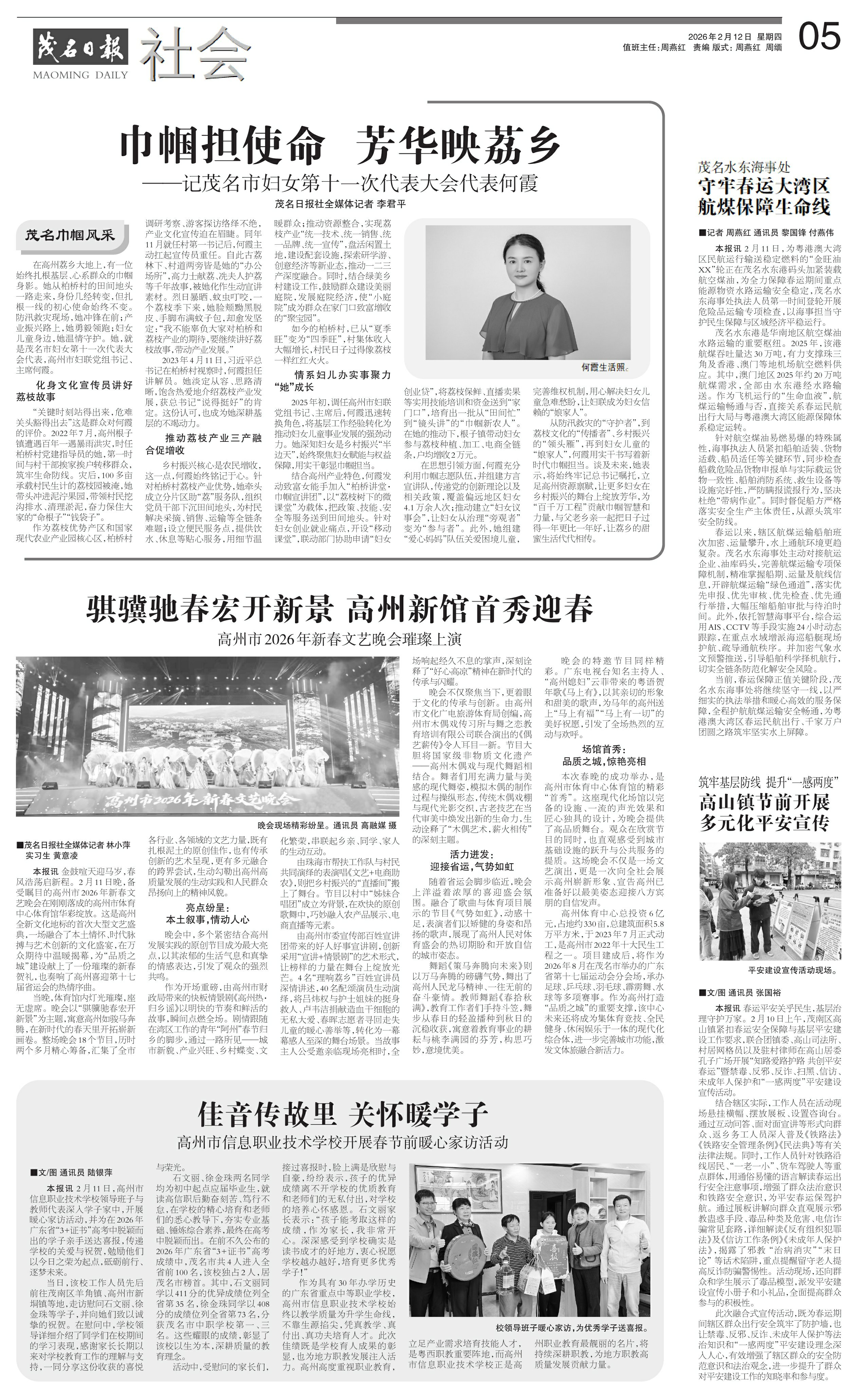 晚会的特邀节目同样精彩。广东电视台知名主持人、“高州媳妇”云菲带来的粤语贺年歌《马上有》,以其亲切的形象和甜美的歌声,为马年的高州送上“马上有福”“马上有一切”的美好祝愿,引发了全场热烈的互动与欢呼。