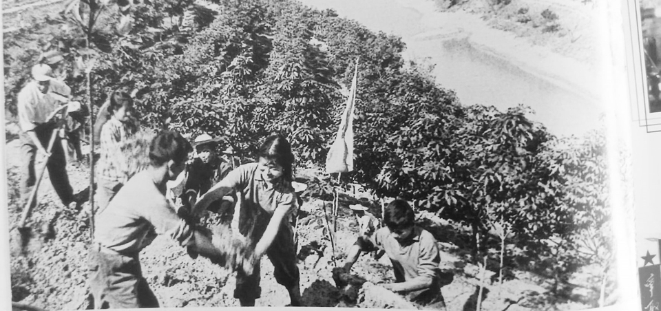 上世纪六七十年代,正是知识青年到农村去,到边疆去,到祖国最需要的地方去的高潮。这时从广州、汕头、湛江、高州、化州、梅菉等城市的知识青年汇集到了穷乡僻野的化州红峰农场。他们大多只有十七八岁,最大的也只二十多岁,远离了亲人,远离了熟悉的闹市,远离了舒适的城市生活。但他们毫无怨言,更没有愁眉苦脸,而是豪情满怀,壮志凌云,以笑脸迎接困难。照片为当年化州县红峰农场三队的知青们和农场工人们并肩劳作、艰苦奋斗的画面。当年他们喊出的口号是“与天斗,其乐无穷;与地斗,其乐无穷”。用双手搬石块,用锄头挖硬土,硬是用汗水和意志,筑起了一条条如腰带环山的林带,让胶树在良好的水土保持中茁壮成长,把昔日的乱山岗打造成了胶林成片、绿树成荫的理想橡胶国。