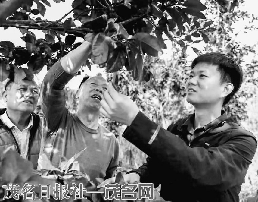 廖志略和农业专家们在观察橘红树的生长情况。
