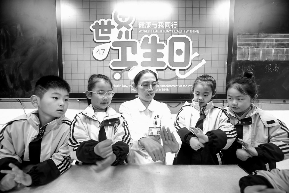 4月7日,在江苏省连云港市院前小学,医务人员给学生讲解“七步洗手法”。 新华社发(王春 摄)