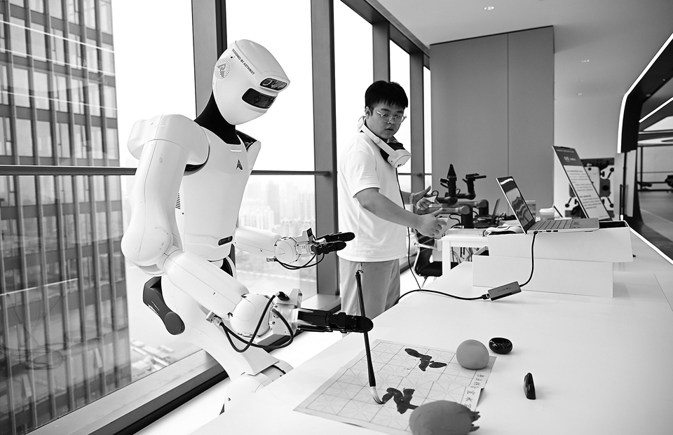 4月7日,在广州海珠区的广东省具身智能训练场,工作人员训练机器人写毛笔字。