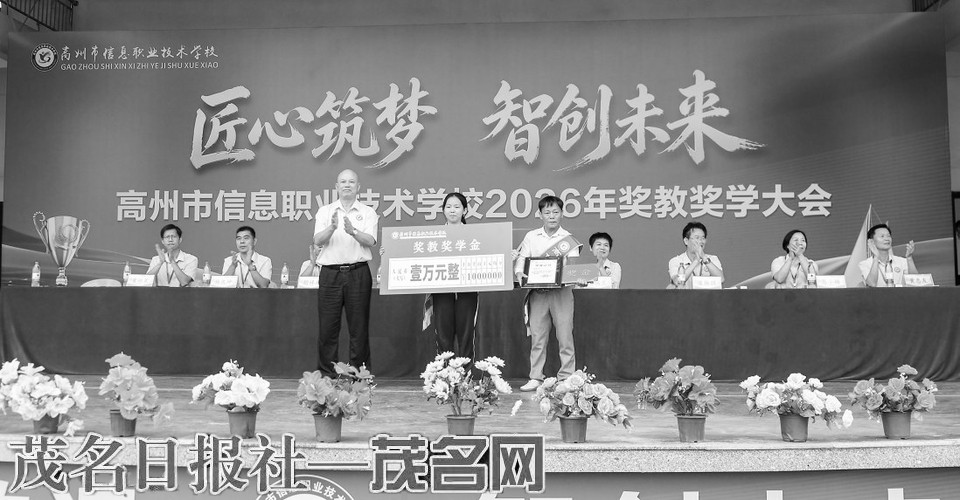 本报讯 4月24日上午,高州市信息职业技术学校足球场上,醒狮腾跃,锣鼓喧天。在激昂的鼓点中,醒狮队昂首开道,引领着佩戴绶带的优秀学子踏上红地毯——他们中有考上“小清华”等职教重点院校的佼佼者,有在技能竞赛中的获奖能手,还有从校园走向社会的创业就业明星。紧随其后的受表彰教师与家长代表同样意气风发,两侧掌声、欢呼声此起彼伏。以“匠心筑梦·智创未来”为主题的2026年奖教奖学大会在这里隆重举行,全程直播,吸引线上线下数万名师生、家长共同见证这一荣耀时刻。