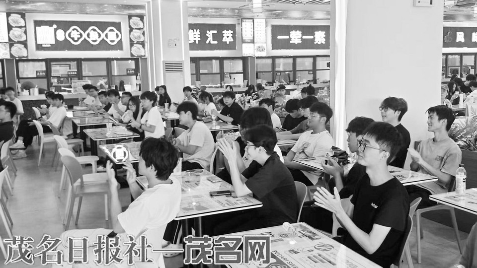 本报讯 4月26日,粤超联赛茂名主场迎战云浮队,激烈精彩的竞技对决在广大青年群体中掀起观赛热潮,收获了一众年轻球迷的关注与喜爱。为方便学子感受本土体育魅力,广东石油化工学院西城校区开设线下观赛点,当日大批在校学子齐聚校园食堂大屏前在(如下图),以青春之声为茂名主场球队呐喊助威。