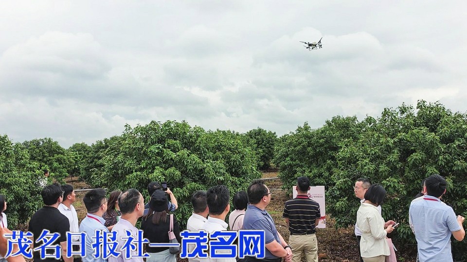 广垦荔枝火星优品基地技术人员向考察团展示农用无人机现场作业。